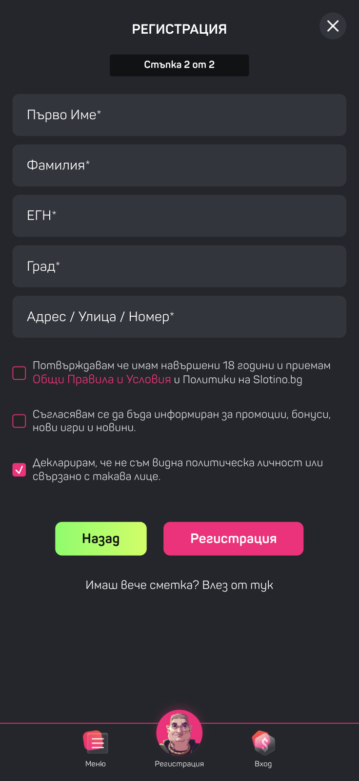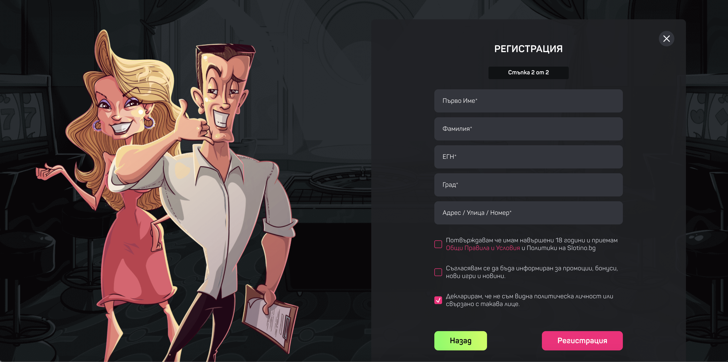 Потвърди, че си навършил 18 години, че не си видна политическа личност и приеми общите правила и условия. Специално в Slotino ти препоръчваме да не изключваш отметката за съобщения, тъй като голяма част от ексклузивните им промоции се изпращат само и единствено по и мейл!