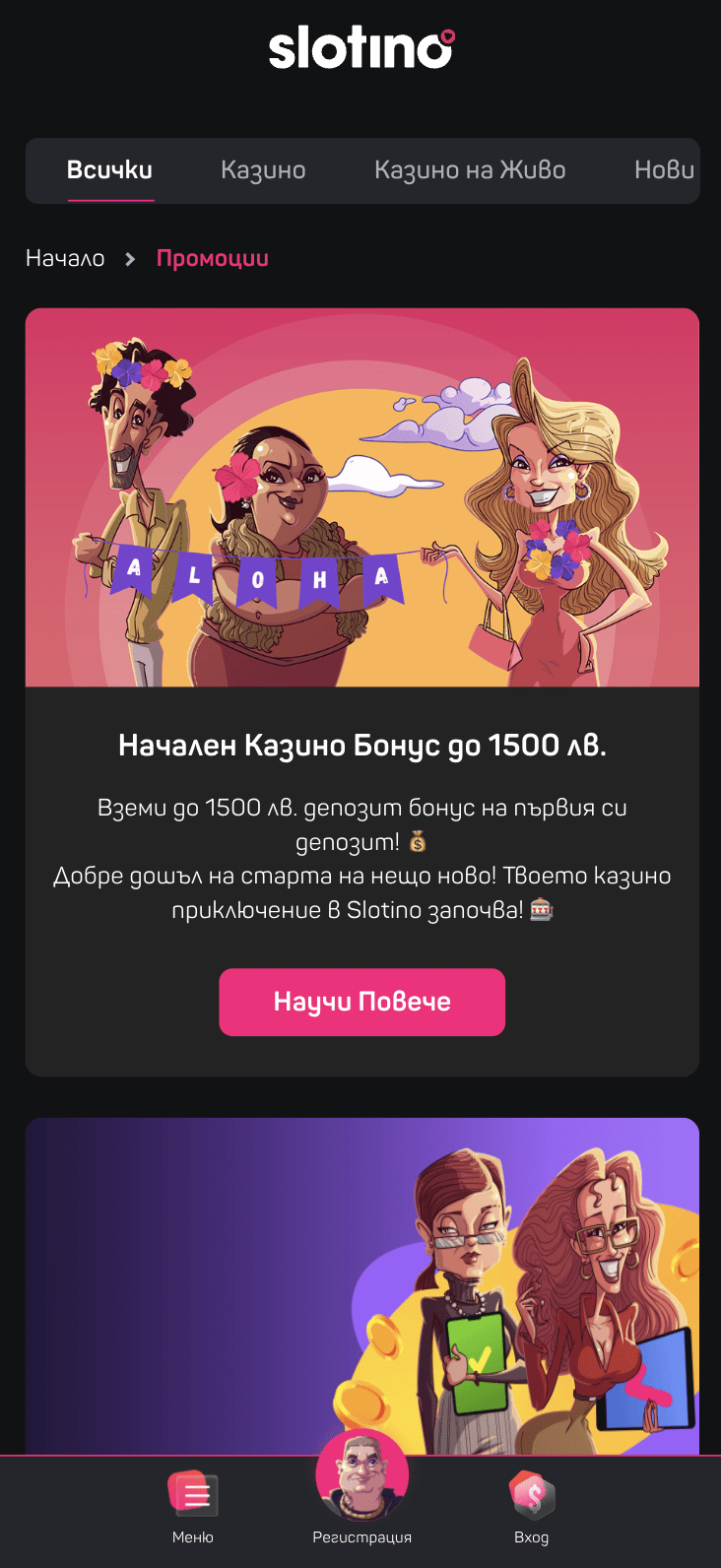 Потопи се в света на Slotino с едни от най-атрактивните казино бонуси, които можеш да намериш. Бонус Колело на Късмета е налично всеки ден, програмата за лоялност е изключително интересна и забавна.